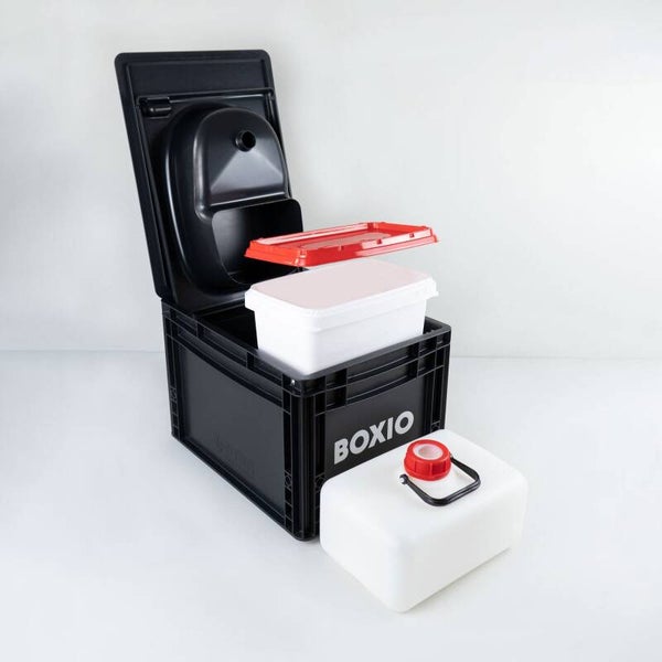BOXIO - TOILET besteht aus leicht zu reinigendem Kunststoff. Hierbei haben wir bei Einkauf und Entwicklung auf Nachhaltigkeit geachtet und arbeiten mit in Deutschland gefertigten Euroboxen, die aus recyceltem Kunststoff gefertigt sind. Weiterhin wird der Trenneinsatz ebenfalls in Deutschland aus einem Regenerat produziert.